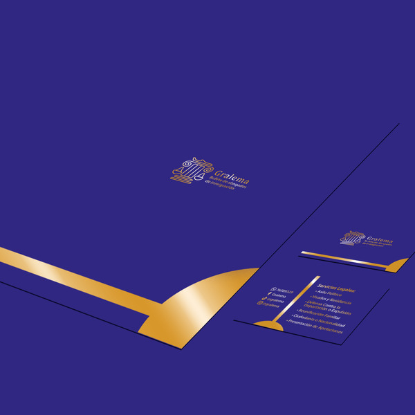 Diseño de papelería del isomagotipo del Bufete de Abogados "Gralema" Se muestra algunas aplicaciones como folder, tarjeta de presentación (anverso y reverso)