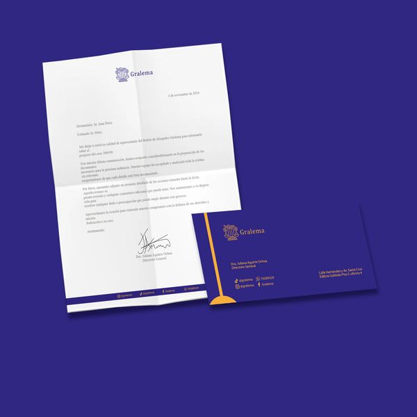 Diseño de papelería del isomagotipo del Bufete de Abogados "Gralema" Se muestra algunas aplicaciones como hoja membretada y el sobre (reverso) manteniendo una línea gráfica y el minimalismo en cada diseño.
